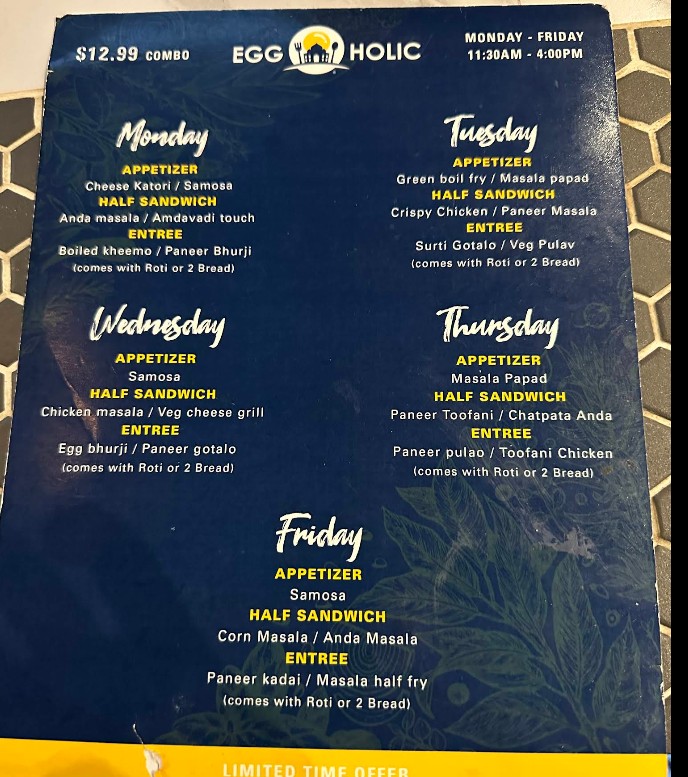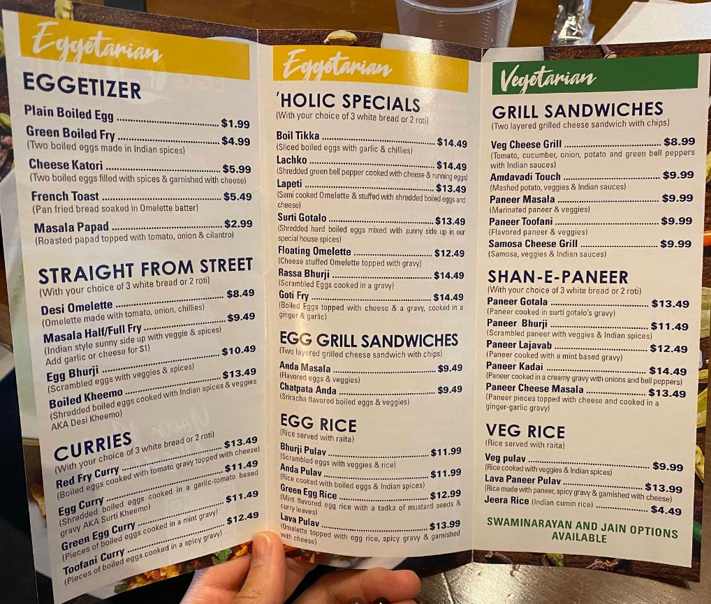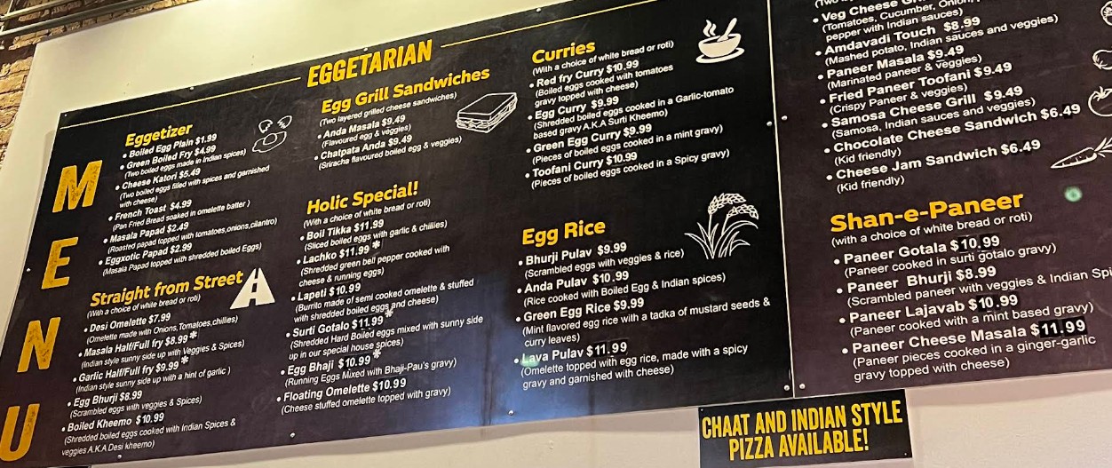 The Eggholic Restaurant menu brings the bold flavors of Indian street food to Chicago with a creative twist centered around eggs. From rich egg curries and flavorful sandwiches to masala-loaded specialties, refreshing lassi, and traditional chai, every dish is crafted with authentic spices and fresh ingredients. Whether you're craving a hearty meal or a quick street-style bite, the Eggholic Restaurant menu offers a vibrant selection that captures the true essence of India’s beloved roadside cuisine.